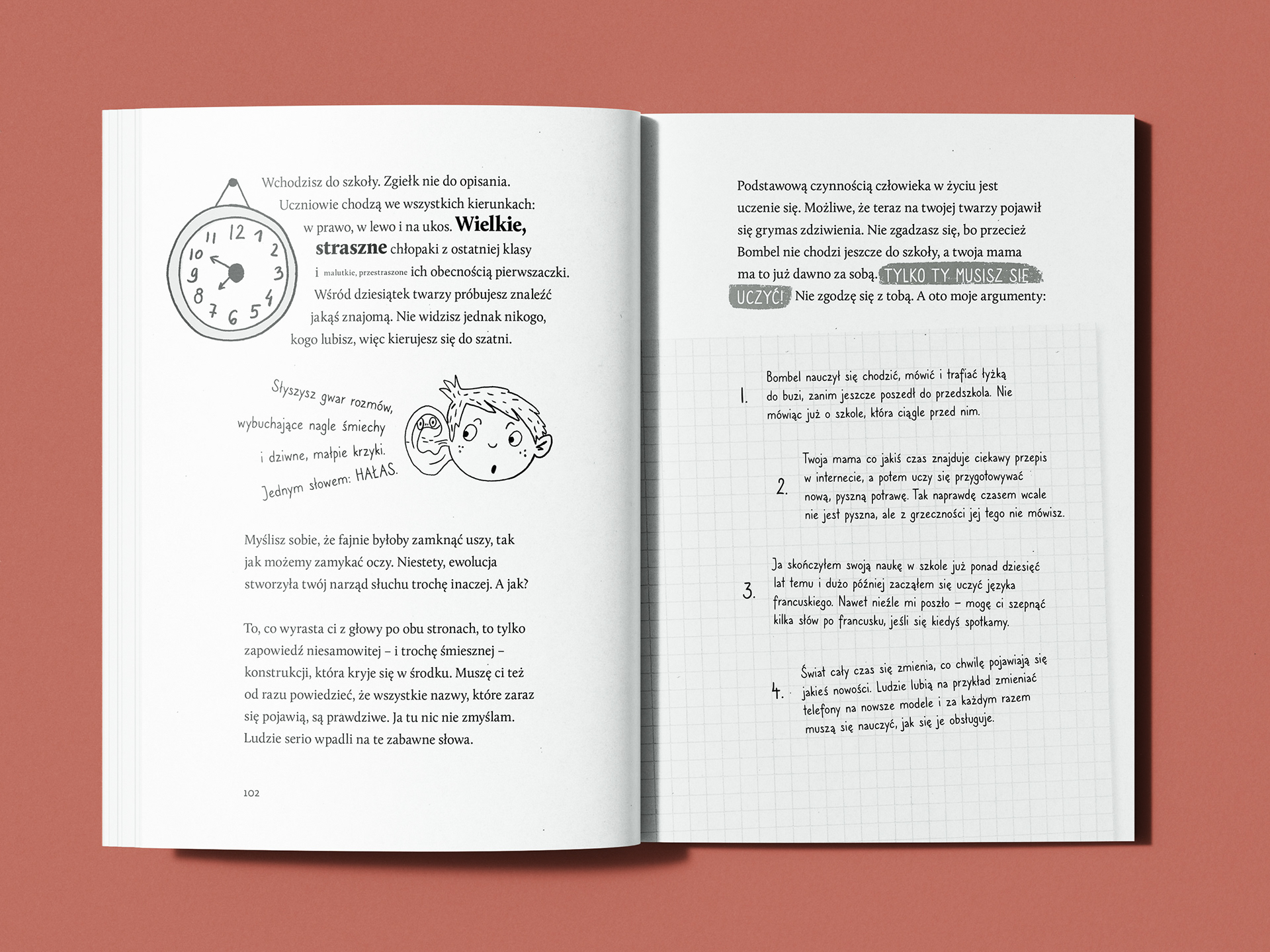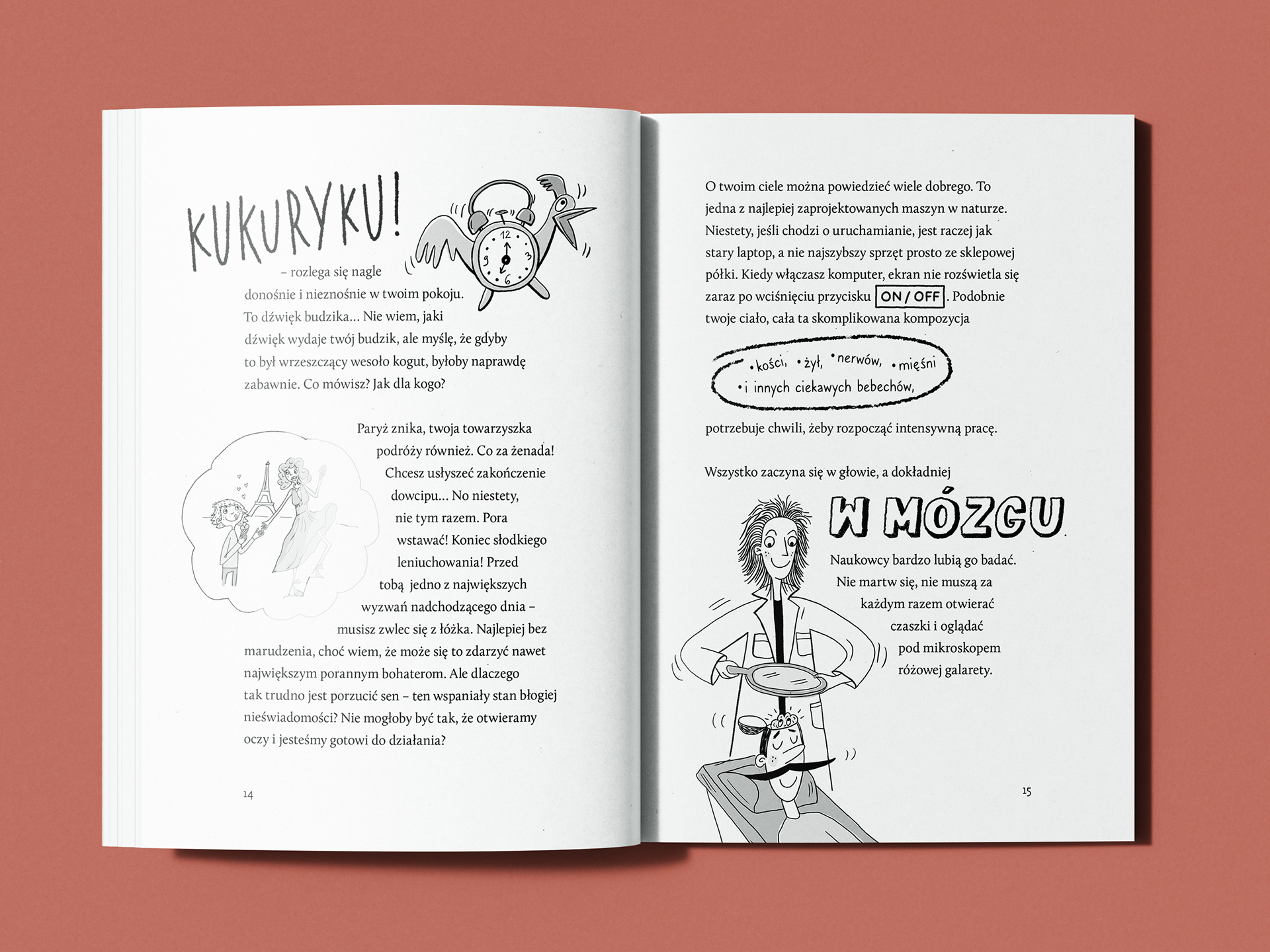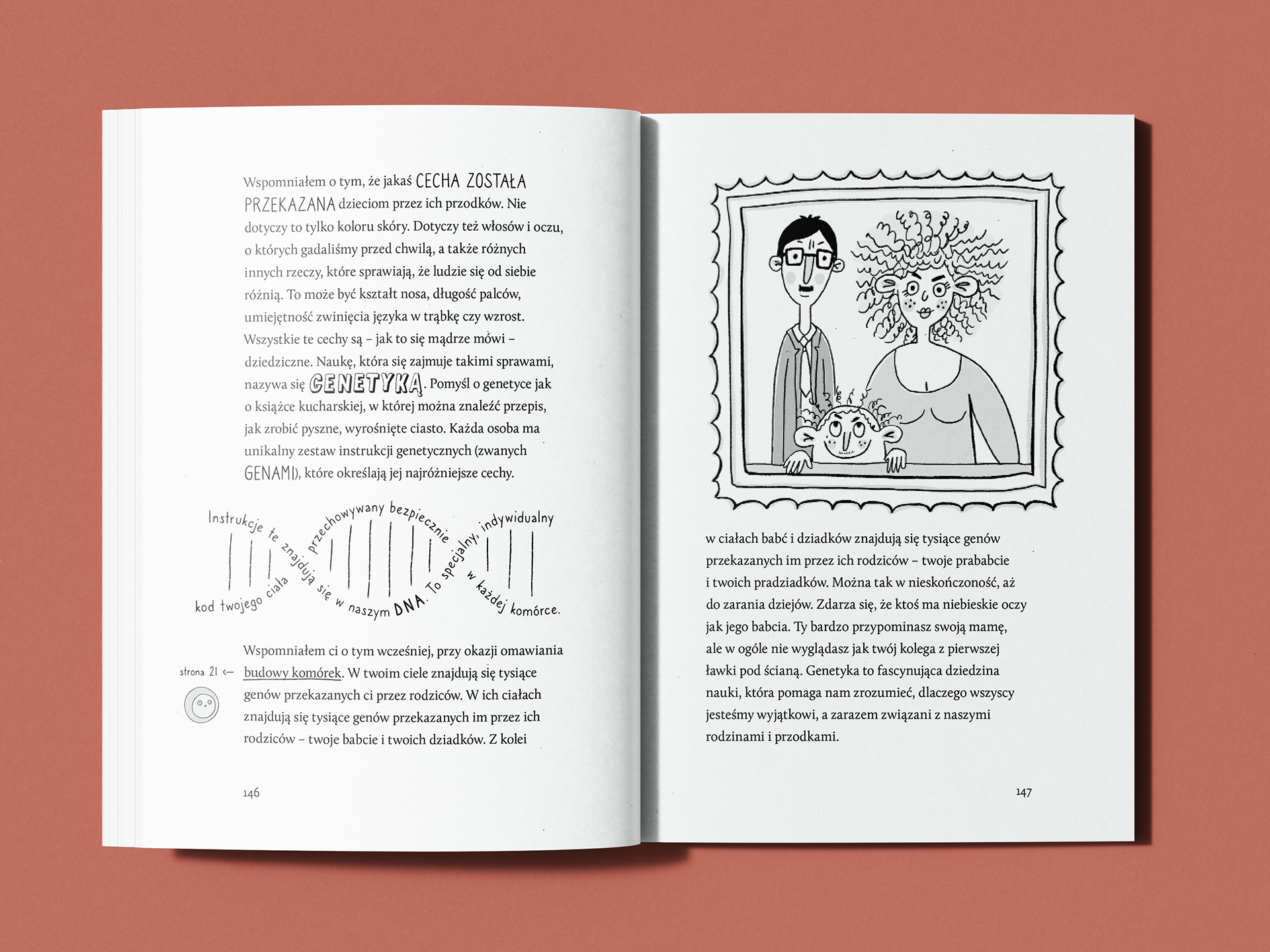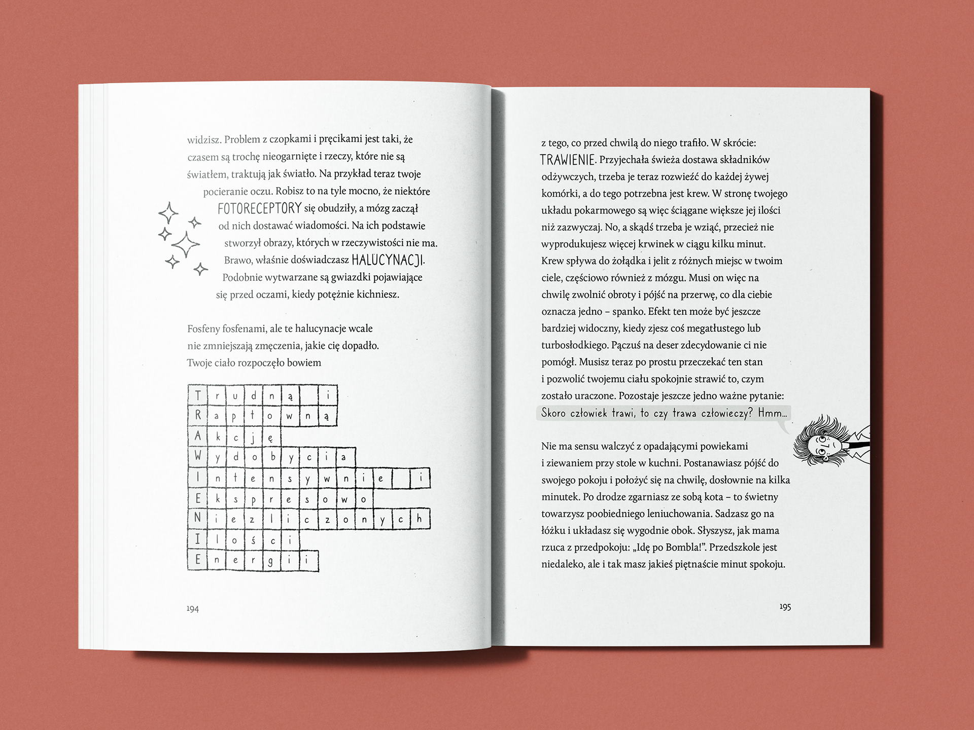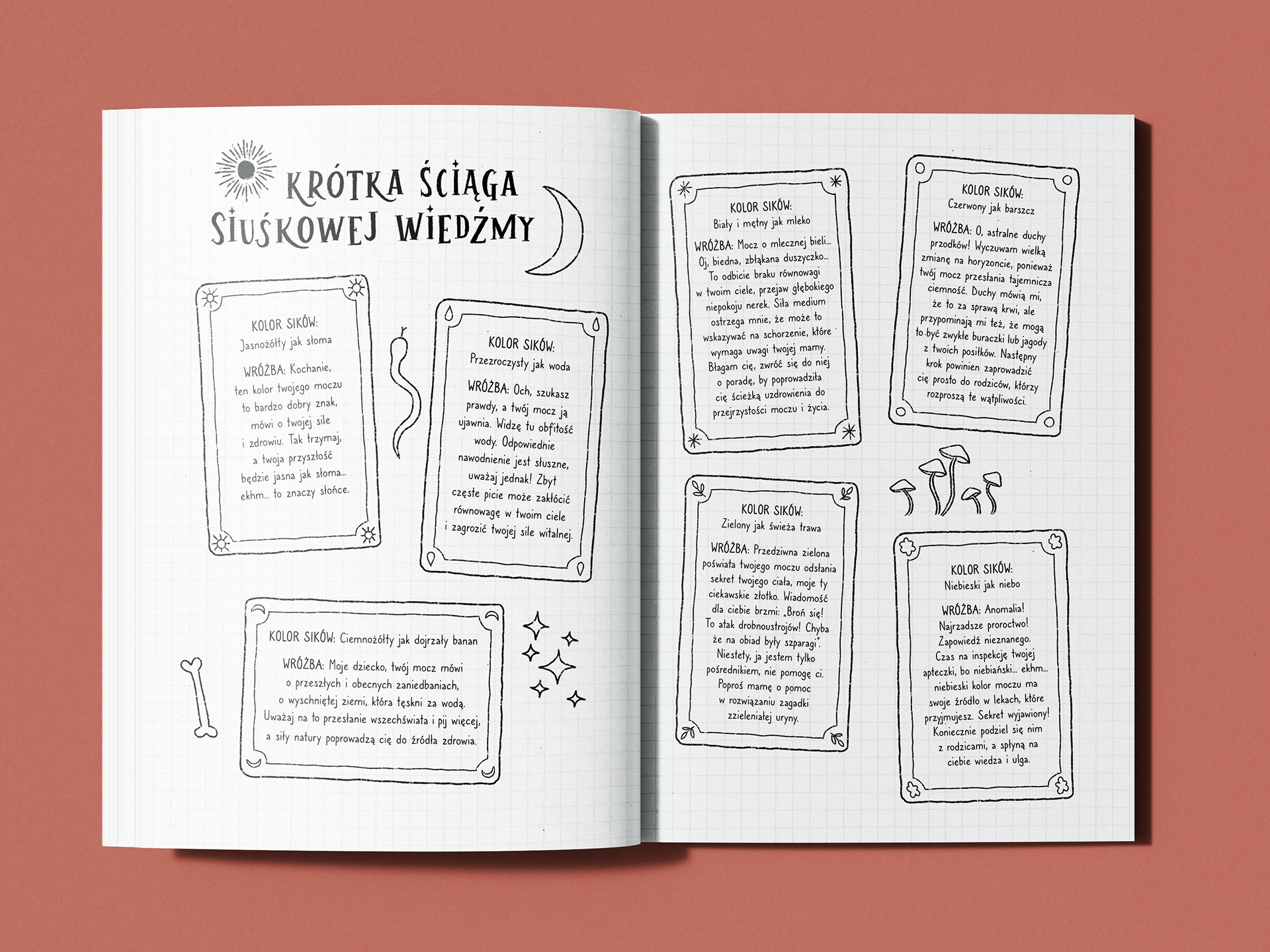 Moim zadaniem było zaprojektowanie layoutu i skład książki, opracowanie typograficznych wyróżnień oraz stworzenie napisów literniczych współgrających z treścią i ilustracjami.